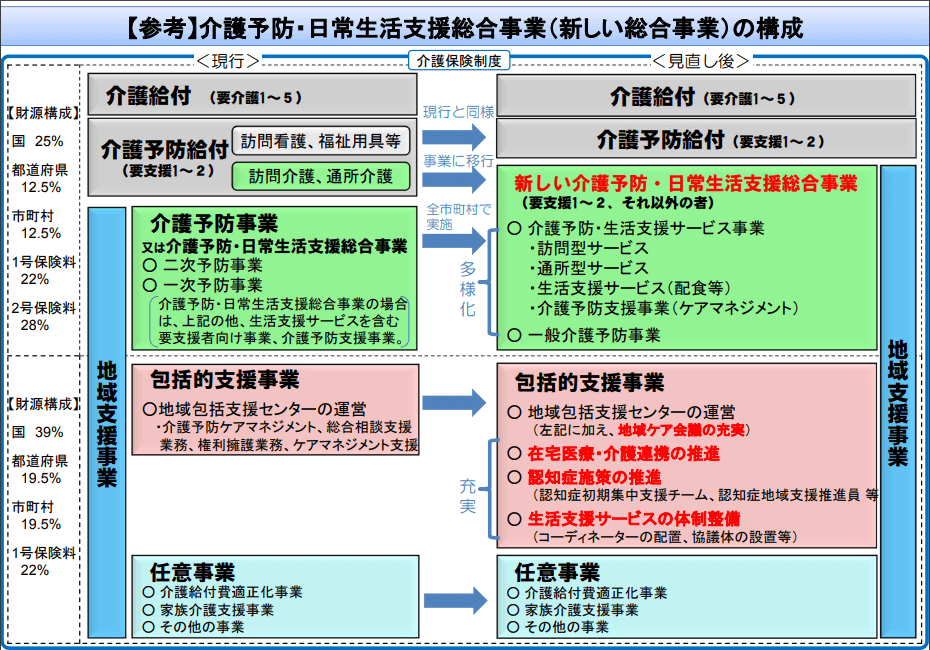 参考元:「厚生労働省」訪問介護、「厚生労働省」介護予防・日常生活支援総合事業の基本的な考え方、「厚生労働省」介護予防・日常生活支援総合事業ガイドライン(概要)、「厚生労働省」(5)介護予防給付(訪問介護・通所介護)の見直しと地域支援事業の充実等